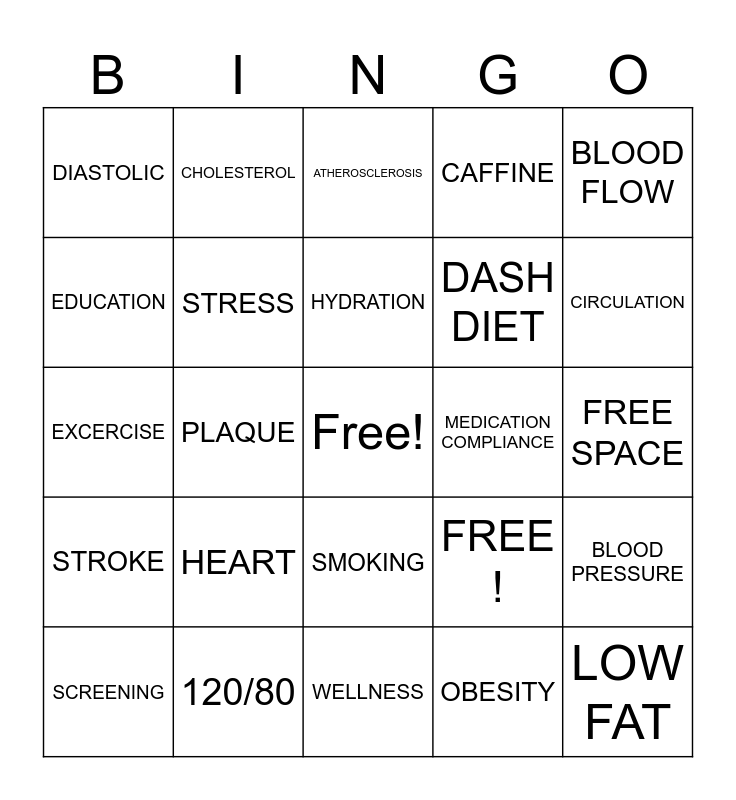 This bingo card has a free space and 25 words: HEART, WELLNESS, HYDRATION, SCREENING, BLOOD FLOW, DIASTOLIC, EDUCATION, CHOLESTEROL, MEDICATION COMPLIANCE, SMOKING, DASH DIET, EXCERCISE, FREE !, BLOOD PRESSURE, STRESS, SYSTOLIC, FREE SPACE, ATHEROSCLEROSIS, CIRCULATION, PLAQUE, LOW FAT, 120/80, STROKE, CAFFINE and OBESITY.