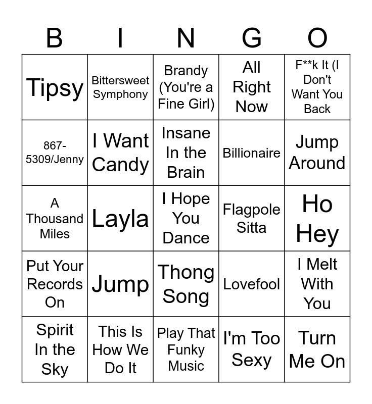 This bingo card has 36 words: 1 Thing, Loser, Achy Breaky Heart, I Want Candy, Lovefool, Put Your Records On, Insane In the Brain, Roll to Me, F**k It (I Don't Want You Back, Electric Avenue, Layla, All Right Now, I Will Survive, Flagpole Sitta, Jump Around, Tipsy, Turn Me On, Jump, I Hope You Dance, Brandy (You're a Fine Girl), Ho Hey, I Melt With You, This Is How We Do It, Spirit In the Sky, Play That Funky Music, Bittersweet Symphony, A Thousand Miles, Riptide, Billionaire, 867-5309/Jenny, Pump Up the Jame, Black Betty, I'm Too Sexy, Thong Song, Kiss Me and Two of Hearts.