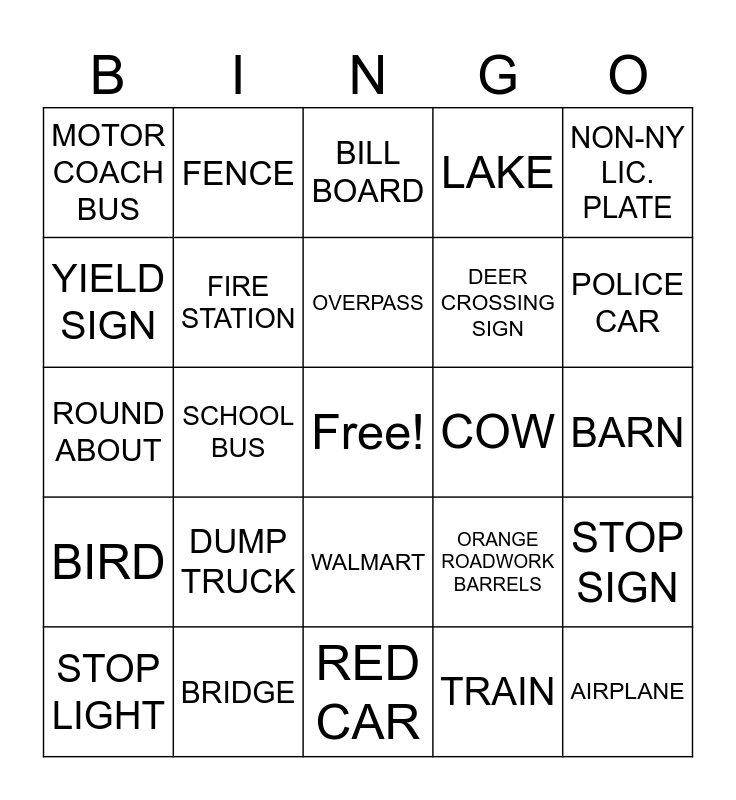 This bingo card has a free space and 24 words: DUMP TRUCK, BRIDGE, OVERPASS, STOP LIGHT, NON-NY LIC. PLATE, MOTOR COACH BUS, YIELD SIGN, FENCE, COW, WALMART, DEER CROSSING SIGN, ROUND ABOUT, ORANGE ROADWORK BARRELS, STOP SIGN, FIRE STATION, TRAIN, BARN, BILL BOARD, POLICE CAR, SCHOOL BUS, AIRPLANE, BIRD, LAKE and RED CAR.