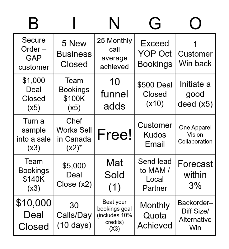 This bingo card has a free space and 24 words: $5,000 Deal Close (x2), 30 Calls/Day (10 days), 10 funnel adds, $10,000 Deal Closed, 1 Customer Win back, Secure Order – GAP customer, $1,000 Deal Closed (x5), 5 New Business Closed, Customer Kudos Email, Mat Sold (1), $500 Deal Closed (x10), Turn a sample into a sale (x3), Send lead to MAM / Local Partner, Forecast within 3%, Team Bookings $100K (x5), Monthly Quota Achieved, One Apparel Vision Collaboration, 25 Monthly call average achieved, Initiate a good deed (x5), Chef Works Sell in Canada (x2)*, Backorder– Diff Size/ Alternative Win, Team Bookings $140K (x3), Exceed YOP Oct Bookings and Beat your bookings goal (includes 10% credits) (X3).
