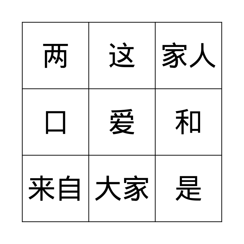 This bingo card has 9 words: 来自, 家人, 这, 口, 两, 和, 爱, 是 and 大家.