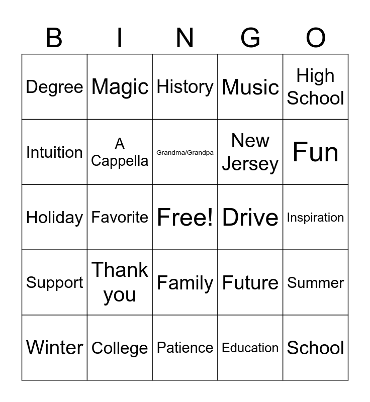 This bingo card has a free space and 26 words: Family, Education, Grandma/Grandpa, College, High School, Degree, Intuition, Magic, Inspiration, Future, New Jersey, Holiday, Summer, Winter, Favorite, Advice, Music, Support, History, School, Fun, Patience, Drive, Thank you, A Cappella and Imagination.