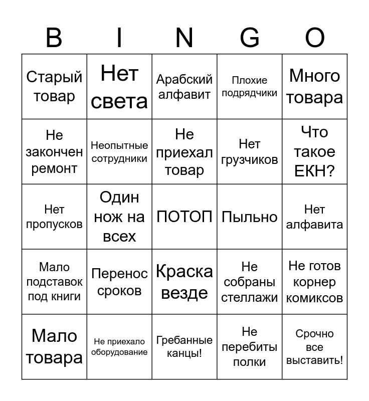 This bingo card has a free space and 24 words: Перенос сроков, Не приехало оборудование, Не приехал товар, Мало товара, Много товара, Старый товар, Не закончен ремонт, Нет света, Пыльно, Краска везде, Нет грузчиков, Нет пропусков, Не собраны стеллажи, Не готов корнер комиксов, Неопытные сотрудники, Не перебиты полки, Нет алфавита, Арабский алфавит, Что такое ЕКН?, Один нож на всех, Срочно все выставить!, Мало подставок под книги, Плохие подрядчики and Гребанные канцы!.