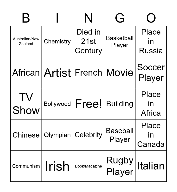 This bingo card has a free space and 106 words: Place in Poland, Place in Iran, Place in Russia, Place in United States, Place in United Kingdom, Place in India, Ancient, Born in 17th Century, Died in 17th Century, Born in 18th Century, Died in 18th Century, Born in 19th Century, Died in 19th Century, Born in 20th Century, Died in 20th Century, Born in 21st Century, Died in 21st Century, Politician, Author, Scientist, Celebrity, Actor, Musician, Military Personnel, Athlete, Olympian, Soccer Player, Basketball Player, Football Player, Hockey Player, Baseball Player, Rugby Player, Cricket Player, Sports Team/Season, American, British, Indian, Canadian, French, Spanish, Brazillian, Mexican, Russian, Chinese, Japanese, African, Middle Eastern, Australian/New Zealand, German, Italian, Korean, Irish, Antarctica, Scandinavian, South American, Fictional, Song, Album, Species, Chemistry, Highway/Road, Church/Historic Site, River/Lake, Mountain, Historic Event, Company, Military Division, Video Game, Movie, TV Show, Bollywood, Book/Magazine, Radio Station, Electoral District, Battle/War, Renaissance, Middle Ages, World War I, World War II, Cold War, Christianity, Islam, Judaism, Railroad/Metro, Still Living, Mathematics, Building, Businessmen, Ruler, Space, Vehicle, Surname, List, Place in Germany, Place in France, Place in Canada, Airline/Airport, Protein, Place in Australia/NZ, Place in Africa, Artist, Item, Website/Program, Lawyer, Communism and Food.