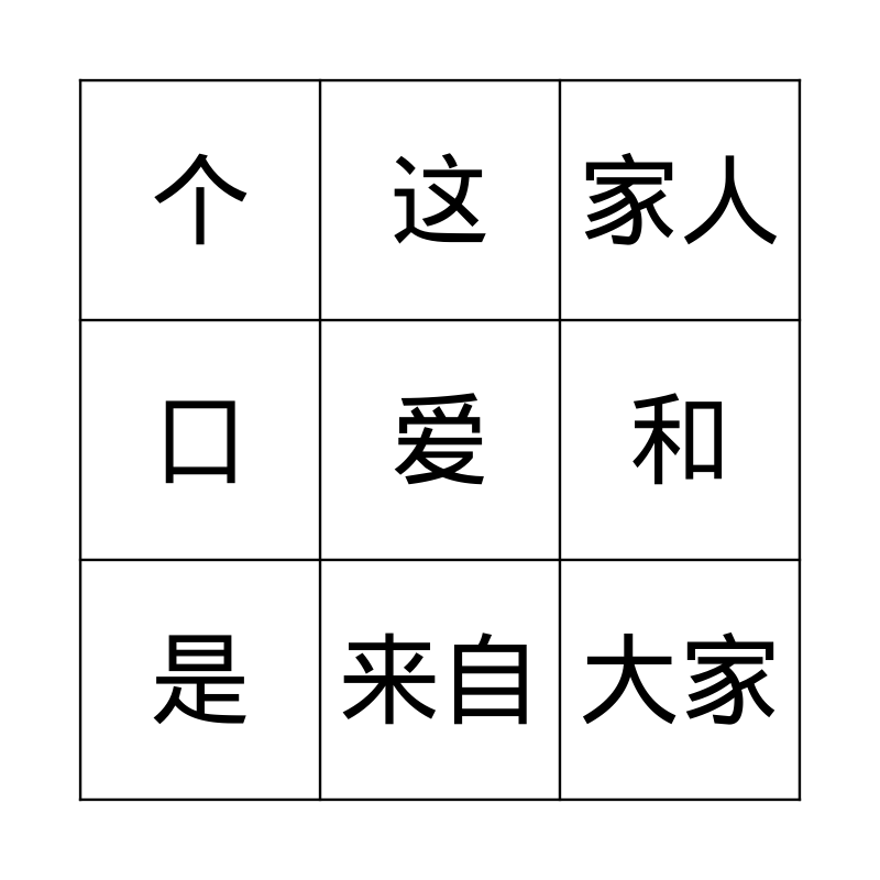 This bingo card has 9 words: 是, 家人, 这, 口, 个, 和, 爱, 大家 and 来自.