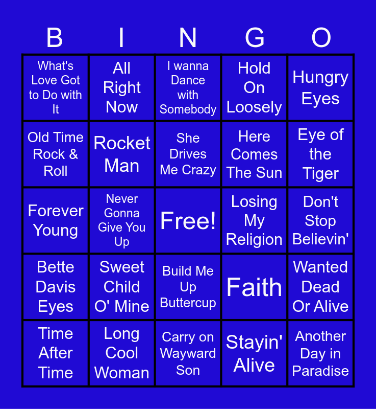 This bingo card has a free space and 24 words: Sweet Child O' Mine, Long Cool Woman, She Drives Me Crazy, Time After Time, Hungry Eyes, What's Love Got to Do with It, Old Time Rock & Roll, All Right Now, Losing My Religion, Build Me Up Buttercup, Here Comes The Sun, Forever Young, Faith, Wanted Dead Or Alive, Rocket Man, Stayin' Alive, Don't Stop Believin', I wanna Dance with Somebody, Eye of the Tiger, Never Gonna Give You Up, Another Day in Paradise, Bette Davis Eyes, Hold On Loosely and Carry on Wayward Son.