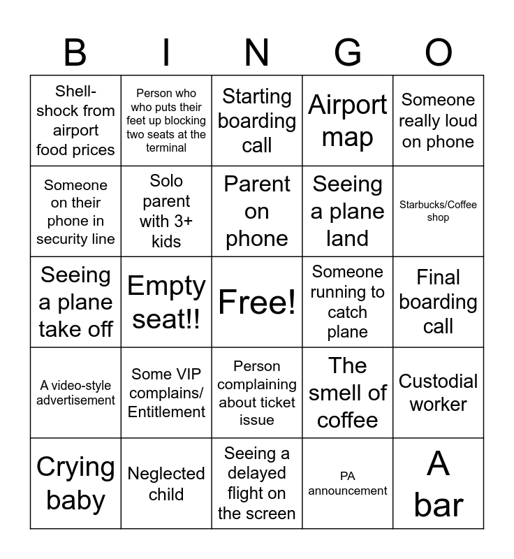This bingo card has a free space and 24 words: Some VIP complains/ Entitlement, Neglected child, Parent on phone, Crying baby, Someone really loud on phone, Shell-shock from airport food prices, Someone on their phone in security line, Person who who puts their feet up blocking two seats at the terminal, Someone running to catch plane, Person complaining about ticket issue, Seeing a plane land, Seeing a plane take off, The smell of coffee, Custodial worker, Solo parent with 3+ kids, PA announcement, Final boarding call, Starting boarding call, Starbucks/Coffee shop, Empty seat!!, A bar, A video-style advertisement, Airport map and Seeing a delayed flight on the screen.