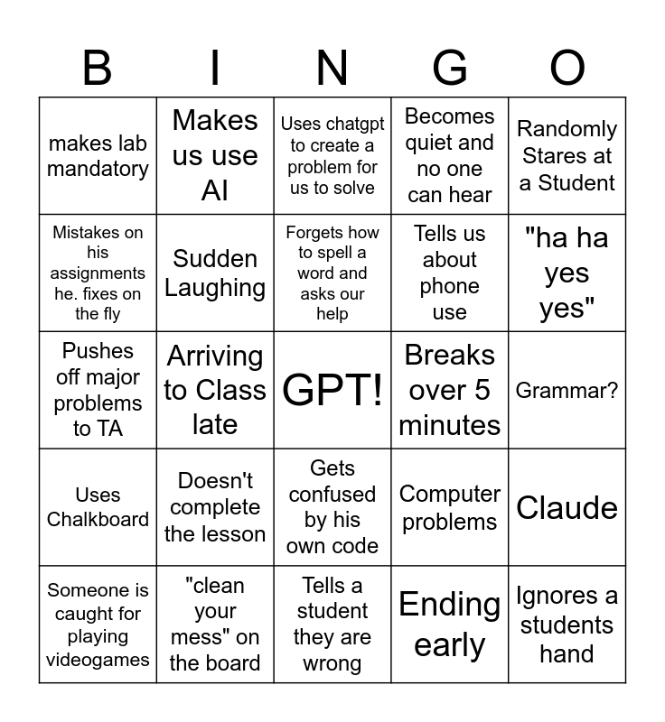 This bingo card has a free space and 32 words: Ending early, Copy Paste Code, Arriving to Class late, Random Tangent, Uses Chalkboard, Sudden Laughing, Randomly Stares at a Student, Claude, Makes us use AI, Uses code we have not learned in an example, Forgets how to spell a word and asks our help, Uses chatgpt to create a problem for us to solve, Wrong deadlines, Tells a student they can't answer a question, Breaks over 5 minutes, Doesn't/poorly erases board, Someone is caught for playing videogames, Pushes off major problems to TA, Gets confused by his own code, Doesn't complete the lesson, Computer problems, Someone falls asleep, Grammar?, "clean your mess" on the board, Ignores a students hand, Becomes quiet and no one can hear, Tells us about phone use, Mistakes on his assignments he. fixes on the fly, makes lab mandatory, Tells a student they are wrong, Tells us about his day and "ha ha yes yes".