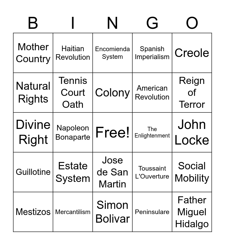 This bingo card has a free space and 24 words: Estate System, Mercantilism, Colony, Mestizos, Creole, Mother Country, Natural Rights, Haitian Revolution, The Enlightenment, Jose de San Martin, American Revolution, Divine Right, Toussaint L'Ouverture, Social Mobility, Tennis Court Oath, Peninsulare, John Locke, Encomienda System, Reign of Terror, Napoleon Bonaparte, Father Miguel Hidalgo, Guillotine, Spanish Imperialism and Simon Bolivar.
