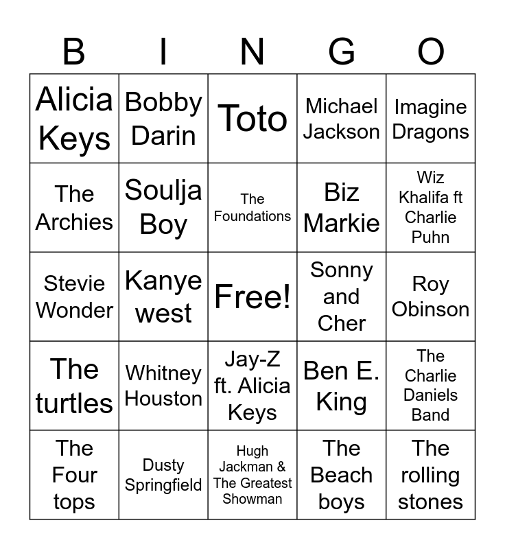 This bingo card has a free space and 24 words: Whitney Houston, Dusty Springfield, The Foundations, The Four tops, Imagine Dragons, Alicia Keys, The Archies, Bobby Darin, Sonny and Cher, Jay-Z ft. Alicia Keys, Biz Markie, Stevie Wonder, Ben E. King, The Charlie Daniels Band, Soulja Boy, The Beach boys, Roy Obinson, Toto, Wiz Khalifa ft Charlie Puhn, Kanye west, The rolling stones, The turtles, Michael Jackson and Hugh Jackman & The Greatest Showman.