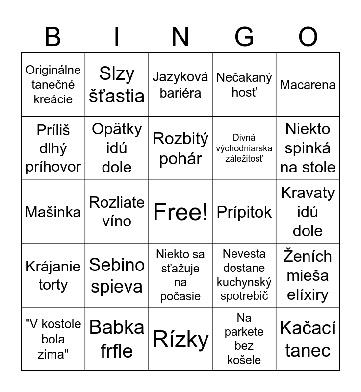 This bingo card has a free space and 24 words: Sebino spieva, Babka frfle, Rozbitý pohár, "V kostole bola zima", Macarena, Originálne tanečné kreácie, Príliš dlhý príhovor, Slzy šťastia, Prípitok, Niekto sa sťažuje na počasie, Divná východniarska záležitosť, Mašinka, Nevesta dostane kuchynský spotrebič, Ženích mieša elíxiry, Opätky idú dole, Na parkete bez košele, Kravaty idú dole, Jazyková bariéra, Niekto spinká na stole, Rozliate víno, Kačací tanec, Krájanie torty, Nečakaný hosť and Rízky.
