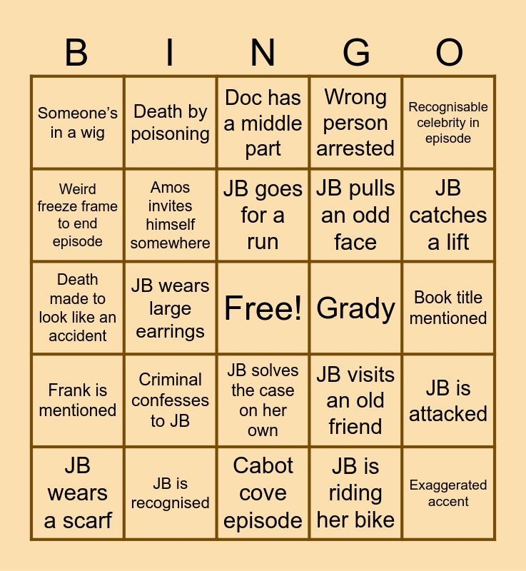 This bingo card has a free space and 29 words: JB wears a scarf, JB wears a broach, JB wears large earrings, JB has access to a crime scene, Someone’s in a wig, Doc has a middle part, Amos invites himself somewhere, Criminal confesses to JB, Grady, JB is recognised, Book title mentioned, Exaggerated accent, Cabot cove episode, JB is riding her bike, JB catches a lift, Someone’s having an affair, JB solves the case on her own, Frank is mentioned, Recognisable celebrity in episode, Death made to look like an accident, JB visits an old friend, JB visits family, JB pulls an odd face, Weird freeze frame to end episode, Wrong person arrested, Death by poisoning, JB is attacked, JB goes for a run and JB is put into an odd situation.