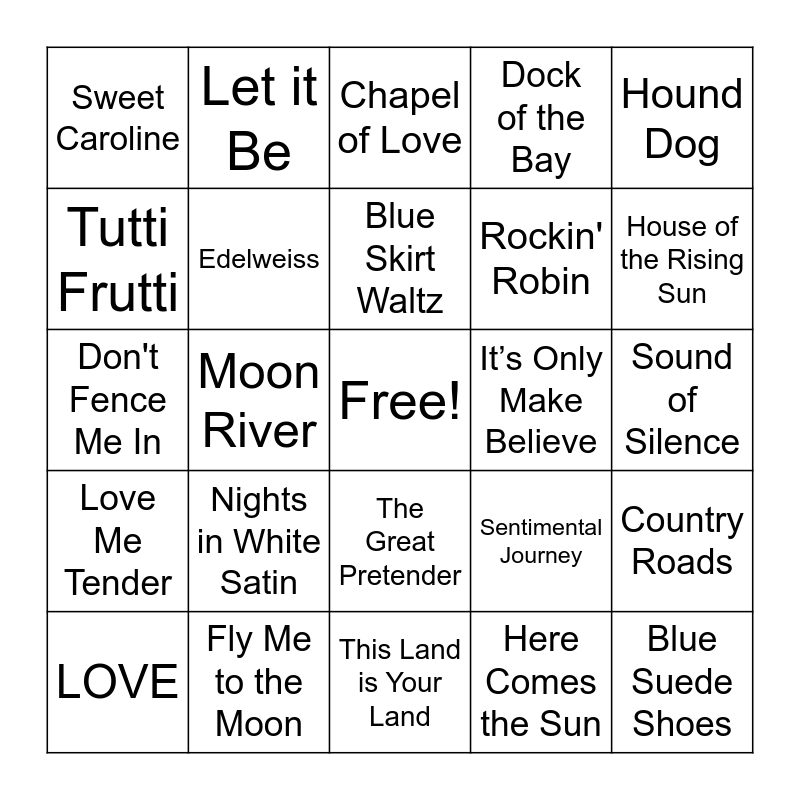 This bingo card has a free space and 41 words: You Are My Sunshine, Don't Fence Me In, Bye Bye Love, Edelweiss, Fly Me to the Moon, The Great Pretender, Blue Skirt Waltz, Blueberry Hill, Hound Dog, Love Me Tender, Moon River, Dock of the Bay, Blue Suede Shoes, Sound of Silence, It’s Only Make Believe, Nights in White Satin, Stand By Me, Sweet Caroline, Can't Help Falling in Love, Chapel of Love, Country Roads, Daydream Believer, This Land is Your Land, Rockin' Robin, Happy Together, Hello Dolly, Here Comes the Sun, Hit the Road Jack, House of the Rising Sun, I Want to Hold Your Hand, Leaving on a Jet Plane, Let it Be, LOVE, Tennessee Waltz, Sentimental Journey, Tutti Frutti, Tiny Bubbles, Unchained Melody, Under the Boardwalk, Que Sera and Oh What A Beautiful Mornin'.