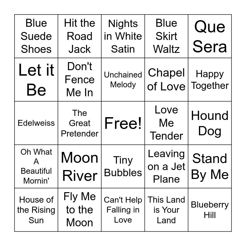 This bingo card has a free space and 41 words: Bye Bye Love, Edelweiss, You Are My Sunshine, Don't Fence Me In, Fly Me to the Moon, Tiny Bubbles, Unchained Melody, Under the Boardwalk, Que Sera, Oh What A Beautiful Mornin', The Great Pretender, Blue Skirt Waltz, Blueberry Hill, Hound Dog, Love Me Tender, Moon River, Dock of the Bay, Blue Suede Shoes, It’s Only Make Believe, Nights in White Satin, Stand By Me, Sweet Caroline, Can't Help Falling in Love, Chapel of Love, Country Roads, Daydream Believer, This Land is Your Land, Rockin' Robin, Happy Together, Hello Dolly, Here Comes the Sun, Hit the Road Jack, House of the Rising Sun, I Want to Hold Your Hand, Leaving on a Jet Plane, Let it Be, LOVE, Tennessee Waltz, Sentimental Journey, Tutti Frutti and Sound of Silence.