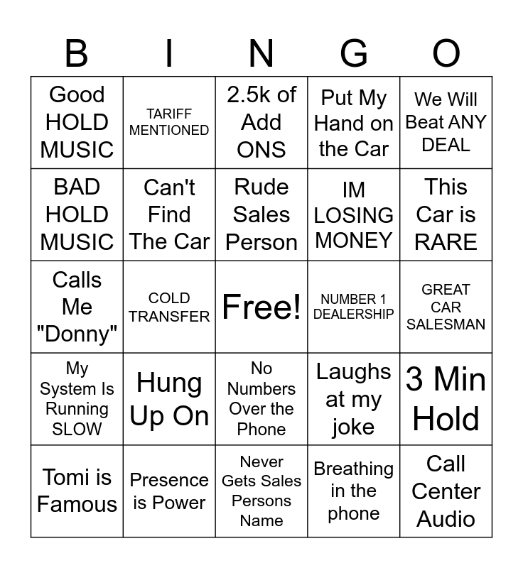 This bingo card has a free space and 24 words: Hung Up On, Presence is Power, Rude Sales Person, Tomi is Famous, We Will Beat ANY DEAL, Good HOLD MUSIC, BAD HOLD MUSIC, TARIFF MENTIONED, NUMBER 1 DEALERSHIP, No Numbers Over the Phone, IM LOSING MONEY, Calls Me "Donny", Laughs at my joke, 3 Min Hold, Can't Find The Car, Breathing in the phone, GREAT CAR SALESMAN, 2.5k of Add ONS, This Car is RARE, COLD TRANSFER, Call Center Audio, My System Is Running SLOW, Put My Hand on the Car and Never Gets Sales Persons Name.