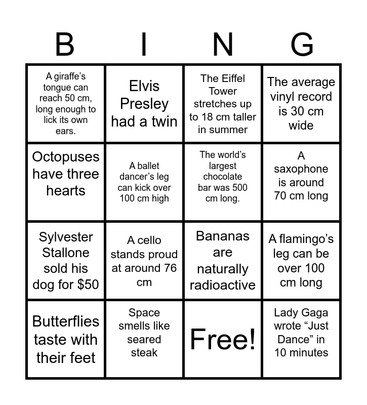 This bingo card has 17 words: Free!, Butterflies taste with their feet, The Eiffel Tower stretches up to 18 cm taller in summer, A giraffe’s tongue can reach 50 cm, long enough to lick its own ears., A cello stands proud at around 76 cm, The average vinyl record is 30 cm wide, A flamingo’s leg can be over 100 cm long, The world’s largest chocolate bar was 500 cm long., A saxophone is around 70 cm long, A ballet dancer’s leg can kick over 100 cm high, Space smells like seared steak, Bananas are naturally radioactive, Octopuses have three hearts, Elvis Presley had a twin, Sylvester Stallone sold his dog for $50, Neil Patrick Harris is a skilled magician and Lady Gaga wrote “Just Dance” in 10 minutes.