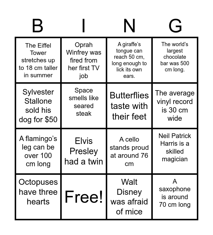 This bingo card has 21 words: Free!, Lightning is hotter than the sun, Oprah Winfrey was fired from her first TV job, Honey never spoils, Walt Disney was afraid of mice, Butterflies taste with their feet, The Eiffel Tower stretches up to 18 cm taller in summer, A giraffe’s tongue can reach 50 cm, long enough to lick its own ears., A cello stands proud at around 76 cm, The average vinyl record is 30 cm wide, A flamingo’s leg can be over 100 cm long, The world’s largest chocolate bar was 500 cm long., A saxophone is around 70 cm long, A ballet dancer’s leg can kick over 100 cm high, Space smells like seared steak, Bananas are naturally radioactive, Octopuses have three hearts, Elvis Presley had a twin, Sylvester Stallone sold his dog for $50, Neil Patrick Harris is a skilled magician and Lady Gaga wrote “Just Dance” in 10 minutes.