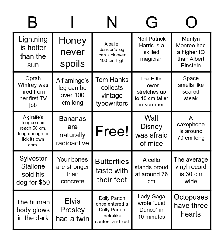 This bingo card has a free space and 25 words: Your bones are stronger than concrete, Dolly Parton once entered a Dolly Parton lookalike contest and lost, Tom Hanks collects vintage typewriters, The human body glows in the dark, Marilyn Monroe had a higher IQ than Albert Einstein, Lightning is hotter than the sun, Oprah Winfrey was fired from her first TV job, Honey never spoils, Walt Disney was afraid of mice, Butterflies taste with their feet, The Eiffel Tower stretches up to 18 cm taller in summer, A giraffe’s tongue can reach 50 cm, long enough to lick its own ears., A cello stands proud at around 76 cm, The average vinyl record is 30 cm wide, A flamingo’s leg can be over 100 cm long, The world’s largest chocolate bar was 500 cm long., A saxophone is around 70 cm long, A ballet dancer’s leg can kick over 100 cm high, Space smells like seared steak, Bananas are naturally radioactive, Octopuses have three hearts, Elvis Presley had a twin, Sylvester Stallone sold his dog for $50, Neil Patrick Harris is a skilled magician and Lady Gaga wrote “Just Dance” in 10 minutes.