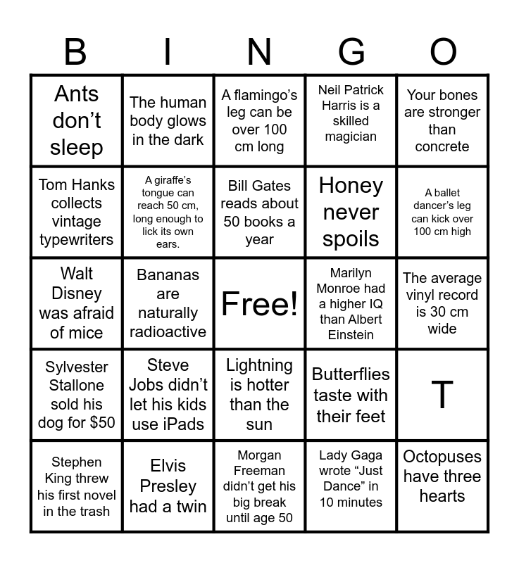 This bingo card has a free space and 25 words: Steve Jobs didn’t let his kids use iPads, Morgan Freeman didn’t get his big break until age 50, Bill Gates reads about 50 books a year, Stephen King threw his first novel in the trash, Your bones are stronger than concrete, Ants don’t sleep, Tom Hanks collects vintage typewriters, The human body glows in the dark, Marilyn Monroe had a higher IQ than Albert Einstein, Lightning is hotter than the sun, Honey never spoils, Walt Disney was afraid of mice, Butterflies taste with their feet, T, A giraffe’s tongue can reach 50 cm, long enough to lick its own ears., A cello stands proud at around 76 cm, The average vinyl record is 30 cm wide, A flamingo’s leg can be over 100 cm long, A ballet dancer’s leg can kick over 100 cm high, Bananas are naturally radioactive, Octopuses have three hearts, Elvis Presley had a twin, Sylvester Stallone sold his dog for $50, Neil Patrick Harris is a skilled magician and Lady Gaga wrote “Just Dance” in 10 minutes.