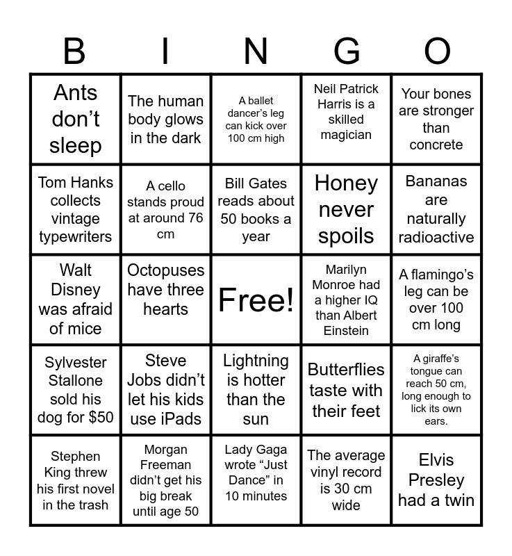 This bingo card has a free space and 24 words: Steve Jobs didn’t let his kids use iPads, Morgan Freeman didn’t get his big break until age 50, Bill Gates reads about 50 books a year, Stephen King threw his first novel in the trash, Your bones are stronger than concrete, Ants don’t sleep, Tom Hanks collects vintage typewriters, The human body glows in the dark, Marilyn Monroe had a higher IQ than Albert Einstein, Lightning is hotter than the sun, Honey never spoils, Walt Disney was afraid of mice, Butterflies taste with their feet, A giraffe’s tongue can reach 50 cm, long enough to lick its own ears., A cello stands proud at around 76 cm, The average vinyl record is 30 cm wide, A flamingo’s leg can be over 100 cm long, A ballet dancer’s leg can kick over 100 cm high, Bananas are naturally radioactive, Octopuses have three hearts, Elvis Presley had a twin, Sylvester Stallone sold his dog for $50, Neil Patrick Harris is a skilled magician and Lady Gaga wrote “Just Dance” in 10 minutes.