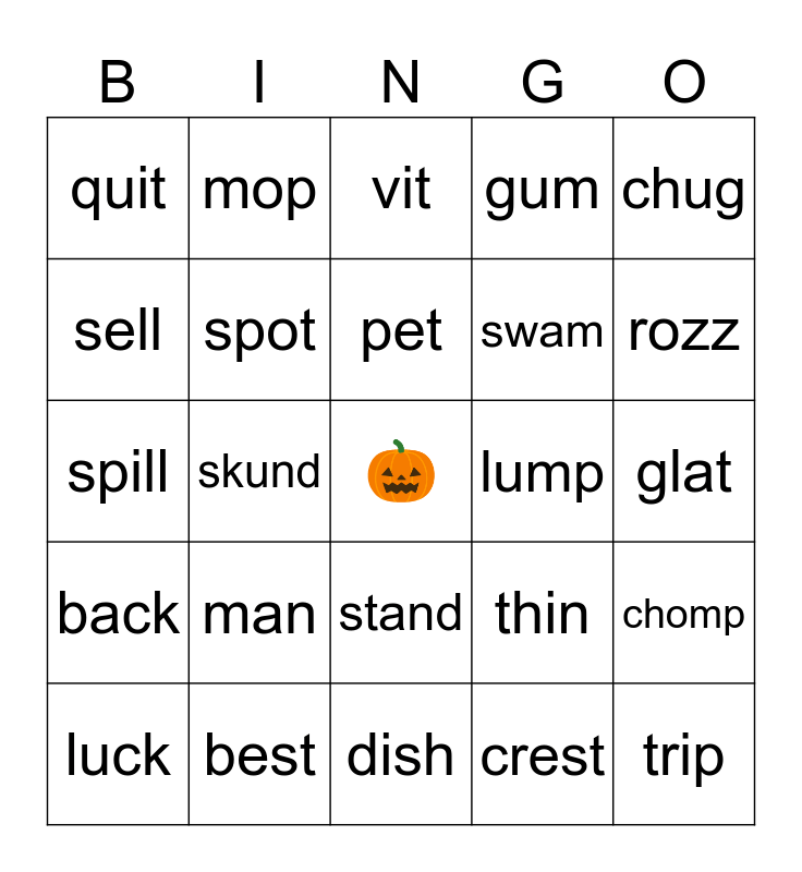 This bingo card has a free space and 24 words: man, best, pet, luck, chug, quit, sell, mop, lump, stand, swam, spill, thin, chomp, spot, crest, glat, vit, rozz, skund, trip, back, gum and dish.