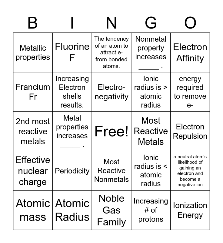 This bingo card has a free space and 24 words: Periodicity, Atomic Radius, Electro-negativity, Atomic mass, Electron Affinity, Metallic properties, Francium Fr, Fluorine F, Most Reactive Metals, Most Reactive Nonmetals, Ionic radius is > atomic radius, 2nd most reactive metals, Ionic radius is < atomic radius, a neutral atom's likelihood of gaining an electron and become a negative ion, Increasing Electron shells results., Increasing # of protons, Electron Repulsion, The tendency of an atom to attract e- from bonded atoms., energy required to remove e-, Metal properties increases _____ ., Ionization Energy, Effective nuclear charge, Nonmetal property increases _____ . and Noble Gas Family.