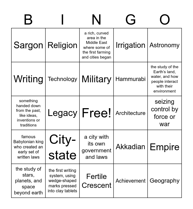 This bingo card has a free space and 50 words: Civilization, Geography, River Valley, Fertile Crescent, City-state, Temple, Religion, Ziggurat, Writing, Cuneiform, Technology, Irrigation, Empire, Akkadian, Conquest, Cultural diffusion, Military, Architecture, Library, Astronomy, Legacy, Achievement, Sargon, Hammurabi, Hammurabi’s code, urban societies; large groups in cities with government, culture, and technology, the study of the Earth’s land, water, and how people interact with their environment, low land with a river, often good for farming, a rich, curved area in the Middle East where some of the first farming and cities began, a city with its own government and laws, a building where people worship their gods and goddesses, beliefs and practices about gods, world, and how people should live, a huge, stepped tower built as a temple in Sumerian cities, recording words, ideas, and information for sharing and remembering, the first writing system, using wedge-shaped marks pressed into clay tablets, tools and inventions that are problem-solving and life easing, a system for bringing water to crops to help them grow, especially in dry places, a vast area with one ruler who controls diverse people and lands, relating to Akkad, the first empire in Mesopotamia, or its people and lands, seizing control by force or war, the spreading of ideas, customs, and technologies from one culture to another, trained group protecting an expanding country or empire, often by fighting, designing and building structures: houses, temples, palaces, a place where books, tablets, or scrolls are collected for reading and learning, the study of stars, planets, and space beyond earth, something handed down from the past, like ideas, inventions or traditions, a great or important thing someone had done or created, Akkadian leader who established the world’s first empire, famous Babylonian king who created an early set of written laws and one of the first written legal system. 282 laws were carved on huge stones and place in public view.