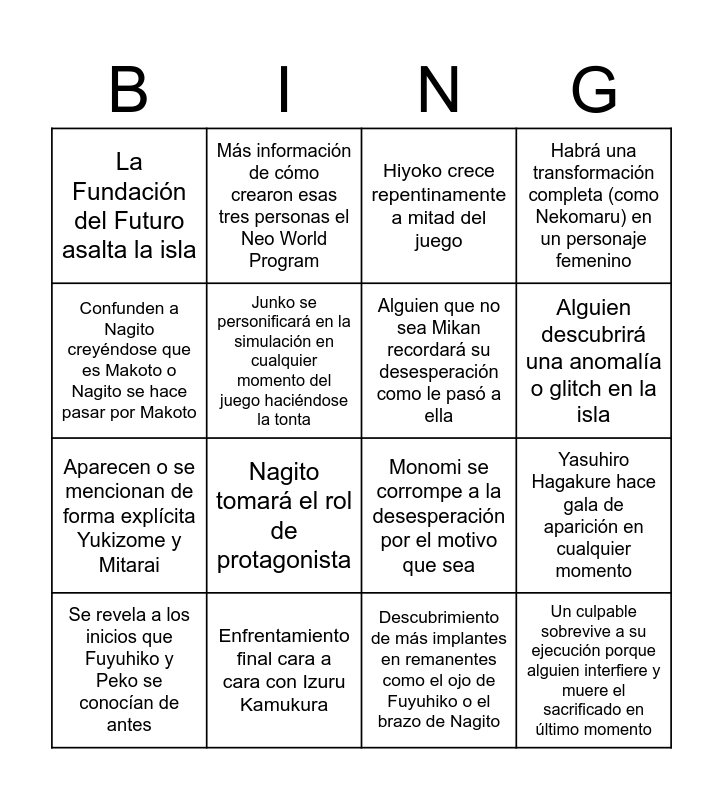 This bingo card has 16 words: Enfrentamiento final cara a cara con Izuru Kamukura, Yasuhiro Hagakure hace gala de aparición en cualquier momento, Hiyoko crece repentinamente a mitad del juego, La Fundación del Futuro asalta la isla, Aparecen o se mencionan de forma explícita Yukizome y Mitarai, Más información de cómo crearon esas tres personas el Neo World Program, Monomi se corrompe a la desesperación por el motivo que sea, Descubrimiento de más implantes en remanentes como el ojo de Fuyuhiko o el brazo de Nagito, Confunden a Nagito creyéndose que es Makoto o Nagito se hace pasar por Makoto, Junko se personificará en la simulación en cualquier momento del juego haciéndose la tonta, Se revela a los inicios que Fuyuhiko y Peko se conocían de antes, Habrá una transformación completa (como Nekomaru) en un personaje femenino, Nagito tomará el rol de protagonista, Alguien descubrirá una anomalía o glitch en la isla, Alguien que no sea Mikan recordará su desesperación como le pasó a ella and Un culpable sobrevive a su ejecución porque alguien interfiere y muere el sacrificado en último momento.