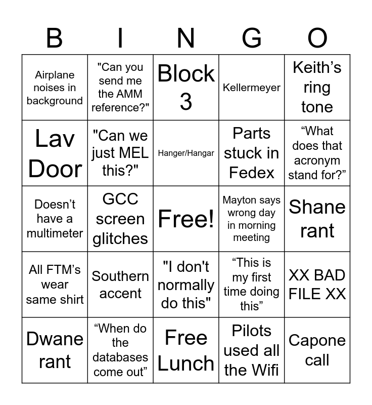 This bingo card has a free space and 24 words: Southern accent, “When do the databases come out”, Hanger/Hangar, Dwane rant, Keith’s ring tone, Airplane noises in background, Lav Door, "Can you send me the AMM reference?", Mayton says wrong day in morning meeting, "I don't normally do this", Parts stuck in Fedex, Doesn’t have a multimeter, “This is my first time doing this”, XX BAD FILE XX, "Can we just MEL this?", Pilots used all the Wifi, Shane rant, Block 3, “What does that acronym stand for?”, GCC screen glitches, Capone call, All FTM’s wear same shirt, Kellermeyer and Free Lunch.