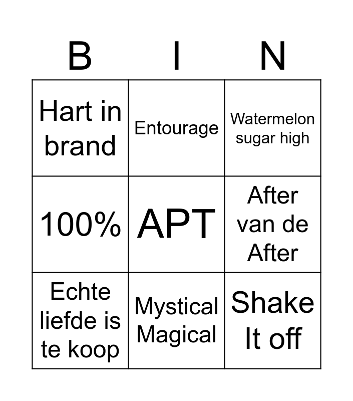 This bingo card has a free space and 14 words: Free!, Lotje, Echte liefde is te koop, Entourage, 100%, Shake It off, Espresso, Anne-Fleur vakantie, Mystical Magical, Hart in brand, Blijven slapen, After van de After, Watermelon sugar high and Messy.