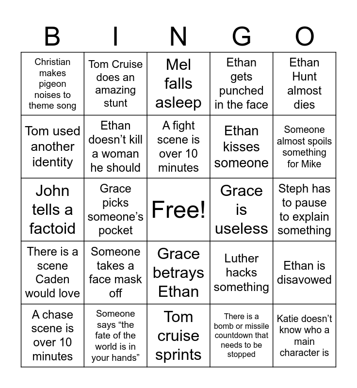 This bingo card has a free space and 24 words: Someone takes a face mask off, Someone says “the fate of the world is in your hands”, A fight scene is over 10 minutes, A chase scene is over 10 minutes, Ethan Hunt almost dies, Christian makes pigeon noises to theme song, Tom used another identity, Tom Cruise does an amazing stunt, Grace is useless, Grace betrays Ethan, Ethan kisses someone, John tells a factoid, Luther hacks something, Ethan is disavowed, Ethan doesn’t kill a woman he should, There is a bomb or missile countdown that needs to be stopped, Steph has to pause to explain something, Mel falls asleep, Someone almost spoils something for Mike, Grace picks someone’s pocket, Katie doesn’t know who a main character is, There is a scene Caden would love, Ethan gets punched in the face and Tom cruise sprints.