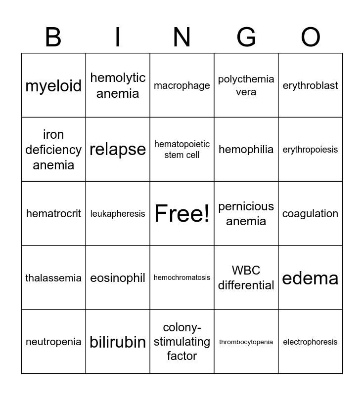 This bingo card has a free space and 24 words: eosinophil, bilirubin, hematopoietic stem cell, neutropenia, erythroblast, myeloid, iron deficiency anemia, hemolytic anemia, pernicious anemia, hemochromatosis, hemophilia, hematrocrit, WBC differential, edema, relapse, thrombocytopenia, coagulation, macrophage, erythropoiesis, leukapheresis, electrophoresis, thalassemia, polycthemia vera and colony-stimulating factor.
