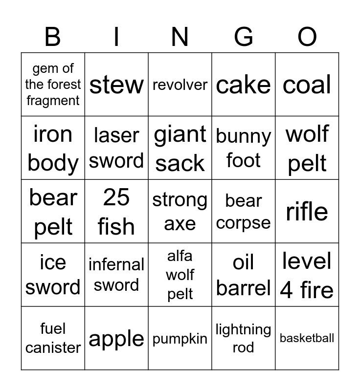 This bingo card has a free space and 24 words: fuel canister, infernal sword, giant sack, lightning rod, coal, gem of the forest fragment, stew, revolver, bear corpse, rifle, bear pelt, laser sword, oil barrel, level 4 fire, iron body, apple, pumpkin, cake, wolf pelt, ice sword, 25 fish, alfa wolf pelt, bunny foot and basketball.