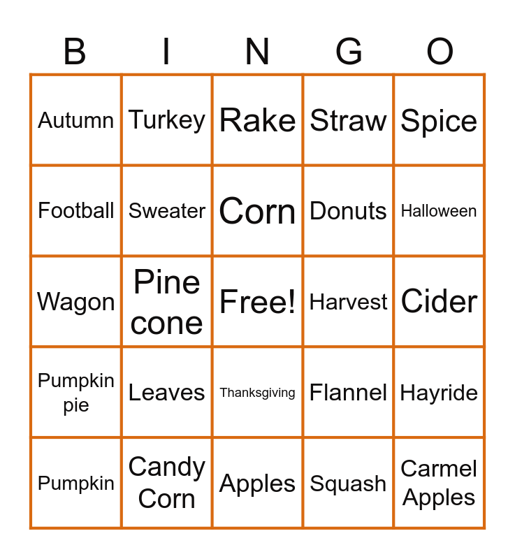 This bingo card has a free space and 24 words: Pumpkin, Leaves, Corn, Squash, Spice, Autumn, Turkey, Rake, Harvest, Cider, Wagon, Sweater, Flannel, Hayride, Football, Candy Corn, Apples, Straw, Halloween, Pumpkin pie, Pine cone, Thanksgiving, Donuts and Carmel Apples.