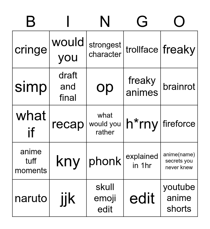 This bingo card has a free space and 24 words: kny, jjk, op, naruto, freaky, cringe, simp, would you, h*rny, phonk, freaky animes, what if, explained in 1hr, anime(name) secrets you never knew, draft and final, edit, fireforce, strongest character, brainrot, recap, youtube anime shorts, anime tuff moments, trollface and skull emoji edit.