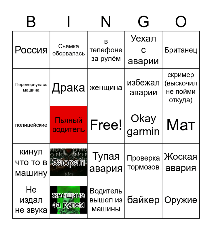 This bingo card has 2 images, a free space and 24 words: Заорал, женщина за рулем, женщина, Не издал не звука, Британец, Россия, Перевернулась машина, Сьемка оборвалась, Okay garmin, Тупая авария, избежал аварии, полицейские, Проверка тормозов, Жоская авария, Драка, байкер, Мат, в телефоне за рулём, скример (выскочил не пойми откуда), Пьяный водитель, Оружие, кинул что то в машину, Уехал с аварии and Водитель вышел из машины.