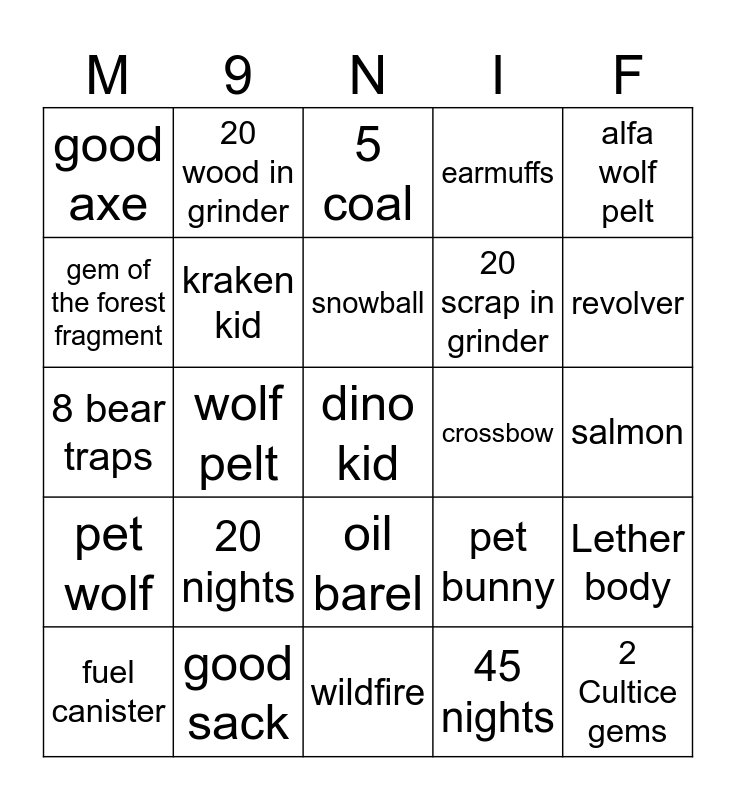 This bingo card has 25 words: pet wolf, good sack, dino kid, 45 nights, alfa wolf pelt, good axe, 20 wood in grinder, 5 coal, crossbow, Lether body, gem of the forest fragment, kraken kid, wildfire, pet bunny, revolver, fuel canister, wolf pelt, snowball, 20 scrap in grinder, salmon, 8 bear traps, 20 nights, oil barel, earmuffs and 2 Cultice gems.