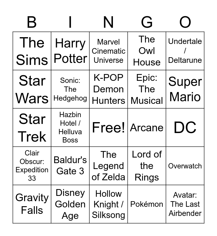 This bingo card has a free space and 24 words: Baldur's Gate 3, Disney Golden Age, K-POP Demon Hunters, Gravity Falls, Undertale / Deltarune, The Sims, Star Wars, Harry Potter, Arcane, The Legend of Zelda, Epic: The Musical, Star Trek, Lord of the Rings, Overwatch, Sonic: The Hedgehog, Pokémon, DC, Marvel Cinematic Universe, Super Mario, Hazbin Hotel / Helluva Boss, Avatar: The Last Airbender, Clair Obscur: Expedition 33, The Owl House and Hollow Knight / Silksong.