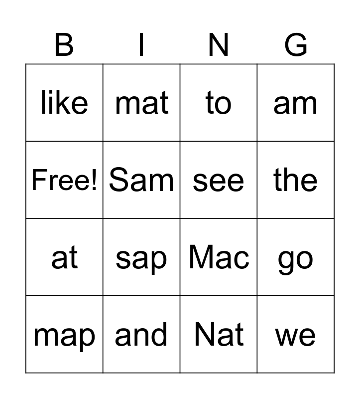 This bingo card has 16 words: and, go, to, like, at, mat, Mac, Nat, Free!, Sam, map, am, sap, the, see and we.