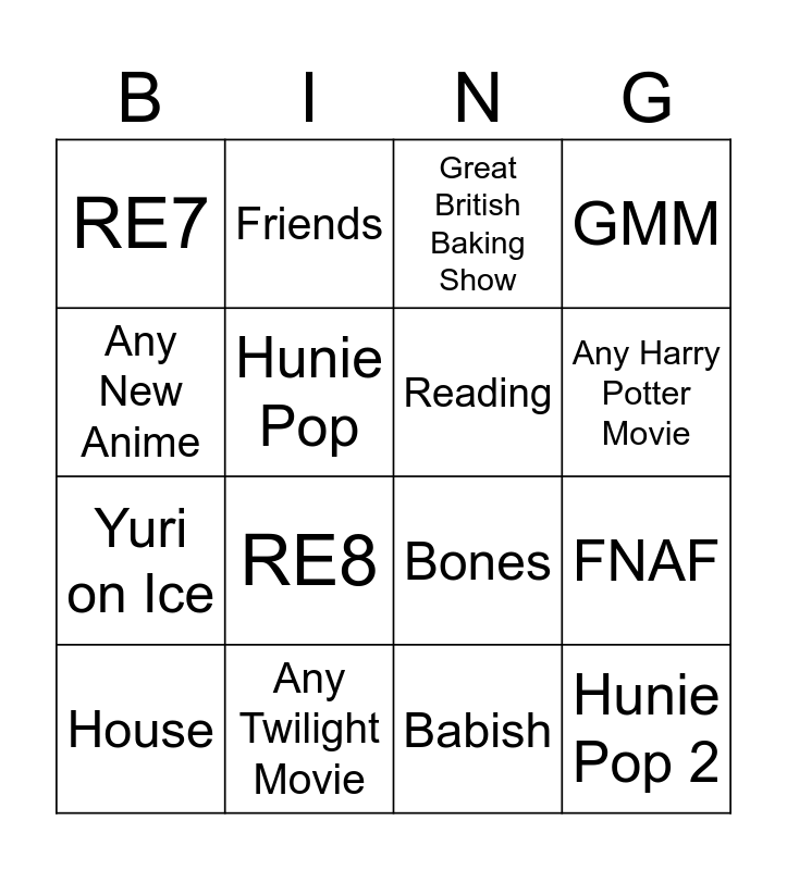 This bingo card has 16 words: Any Twilight Movie, FNAF, Great British Baking Show, RE7, Yuri on Ice, Friends, Bones, Babish, Any New Anime, Hunie Pop, House, GMM, RE8, Any Harry Potter Movie, Reading and Hunie Pop 2.