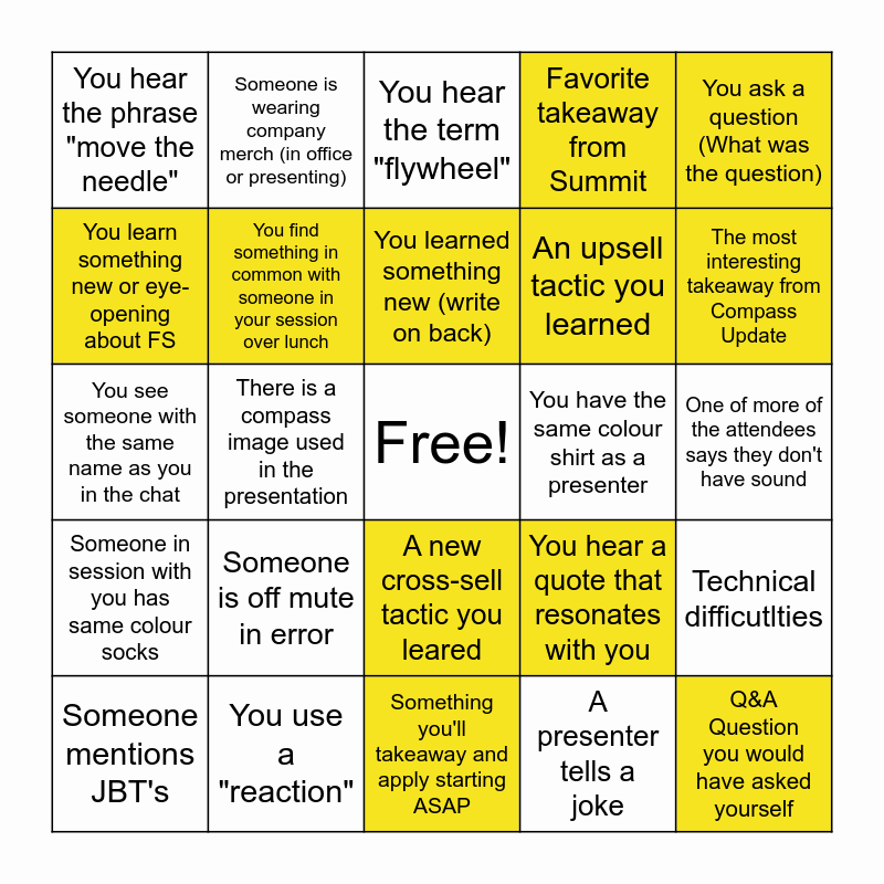 This bingo card has a free space and 24 words: Someone is off mute in error, You use a "reaction", You learned something new (write on back), Someone mentions JBT's, You ask a question (What was the question), You hear the phrase "move the needle", You learn something new or eye-opening about FS, Someone is wearing company merch (in office or presenting), You have the same colour shirt as a presenter, A new cross-sell tactic you leared, An upsell tactic you learned, You see someone with the same name as you in the chat, You hear a quote that resonates with you, Technical difficutlties, You find something in common with someone in your session over lunch, A presenter tells a joke, One of more of the attendees says they don't have sound, You hear the term "flywheel", The most interesting takeaway from Compass Update, There is a compass image used in the presentation, Q&A Question you would have asked yourself, Someone in session with you has same colour socks, Favorite takeaway from Summit and Something you'll takeaway and apply starting ASAP.
