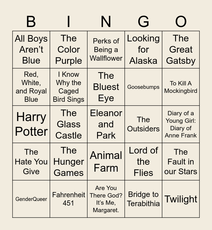 This bingo card has 30 words: Fahrenheit 451, Handmaid’s Tale, The Glass Castle, Percy Jackson and the Olympians, All Boys Aren’t Blue, Perks of Being a Wallflower, I Know Why the Caged Bird Sings, Animal Farm, The Outsiders, Are You There God? It’s Me, Margaret., Diary of a Young Girl: Diary of Anne Frank, Eleanor and Park, Bridge to Terabithia, Twilight, To Kill A Mockingbird, Catcher in the Rye, Lord of the Flies, The Hate You Give, The Hunger Games, The Great Gatsby, Harry Potter, The Giver, The Color Purple, Goosebumps, Red, White, and Royal Blue, Looking for Alaska, The Fault in our Stars, GenderQueer, The Bluest Eye and Flamer.