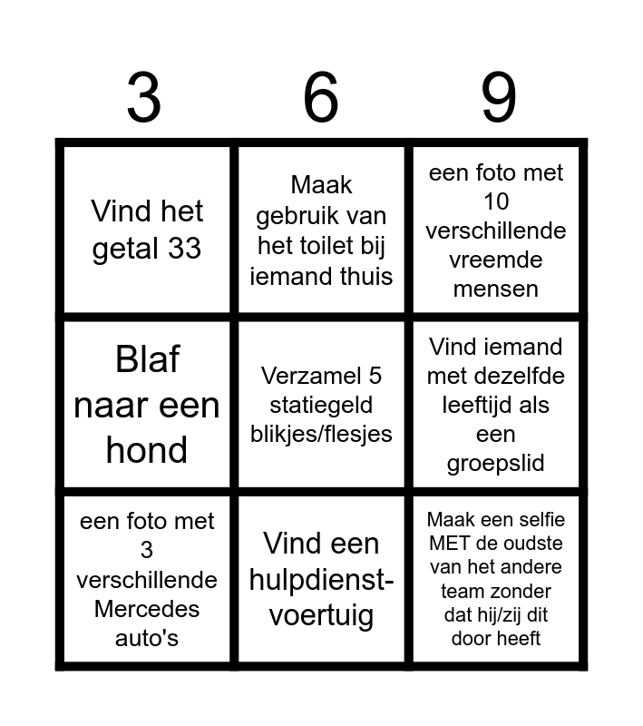 This bingo card has 9 words: een foto met 3 verschillende Mercedes auto's, Verzamel 5 statiegeld blikjes/flesjes, een foto met 10 verschillende vreemde mensen, Vind het getal 33, Maak gebruik van het toilet bij iemand thuis, Vind iemand met dezelfde leeftijd als een groepslid, Blaf naar een hond, Vind een hulpdienst-voertuig and Maak een selfie MET de oudste van het andere team zonder dat hij/zij dit door heeft.