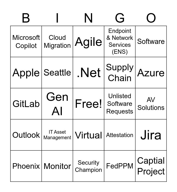 This bingo card has a free space and 100 words: Resolution, Live Stream, AV Solutions, Logitech, Equipment, Video, One Touch, Microphone, Audio, Webcam, Codec, Speaker, HDMI, Monitor, Camera, Audio Mixer, Supply Chain, Reverb, Teams Room, Windows 11 Upgrade, Persona, Tech Café, Digital Adoption, Launchpad PRO, Teams Phone Migration, Unlisted Software Requests, Software, Attestation, Business Partners, Chat Retention, Gen AI, Microsoft Copilot, Onboarding, Innovation, FedPPM, .Net, Jira, Power Platform, CICD, Confluence, AWS, User Story, GitLab, Timesheet, Azure, Agile, PI Planning, Threat Model, API, Security Champion, Scrum Team, Digital Delivery, SDLC, Sharepoint, Test Case, WordPress VIP, Salesforce, Fiber Optic Cable, Laptop, Endpoint & Network Services (ENS), iPhone, Wireless Access Point, Asset Management, Hardware, Incident Report, Ticket, Vending Machine, Help Desk, Bluetooth, ServiceNow, Intune, IT Asset Management, VPN, SLA, WIFI, HP, iPad, Apple, Metrics, Budget, Salt Lake City, Captial Project, System IT, Virtual, RTO, Cloud Migration, Portland, The Bridge, Digital Products, Outlook, Sarah, Los Angeles, Louise, Phoenix, Seattle, San Francisco, OKTA, Ghada, Mary and Town Hall.
