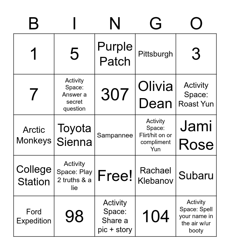 This bingo card has 26 words: Free!, 104, 307, 98, 3, 1, 7, 5, Jami Rose, Rachael Klebanov, Olivia Dean, Arctic Monkeys, Subaru, Ford Expedition, Toyota Sienna, Boston, Pittsburgh, College Station, Purple Patch, Sampannee, Activity Space: Roast Yun, Activity Space: Share a pic + story, Activity Space: Flirt/hit on or compliment Yun, Activity Space: Play 2 truths & a lie, Activity Space: Answer a secret question and Activity Space: Spell your name in the air w/ur booty.