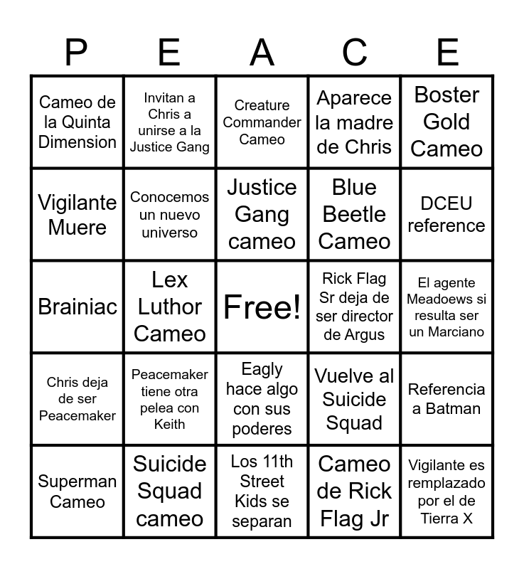 This bingo card has a free space and 24 words: Peacemaker tiene otra pelea con Keith, Suicide Squad cameo, Justice Gang cameo, Superman Cameo, Boster Gold Cameo, Cameo de la Quinta Dimension, Vigilante Muere, Invitan a Chris a unirse a la Justice Gang, Rick Flag Sr deja de ser director de Argus, Eagly hace algo con sus poderes, Blue Beetle Cameo, Brainiac, Vuelve al Suicide Squad, Referencia a Batman, Conocemos un nuevo universo, Cameo de Rick Flag Jr, El agente Meadoews si resulta ser un Marciano, Creature Commander Cameo, DCEU reference, Lex Luthor Cameo, Vigilante es remplazado por el de Tierra X, Chris deja de ser Peacemaker, Aparece la madre de Chris and Los 11th Street Kids se separan.