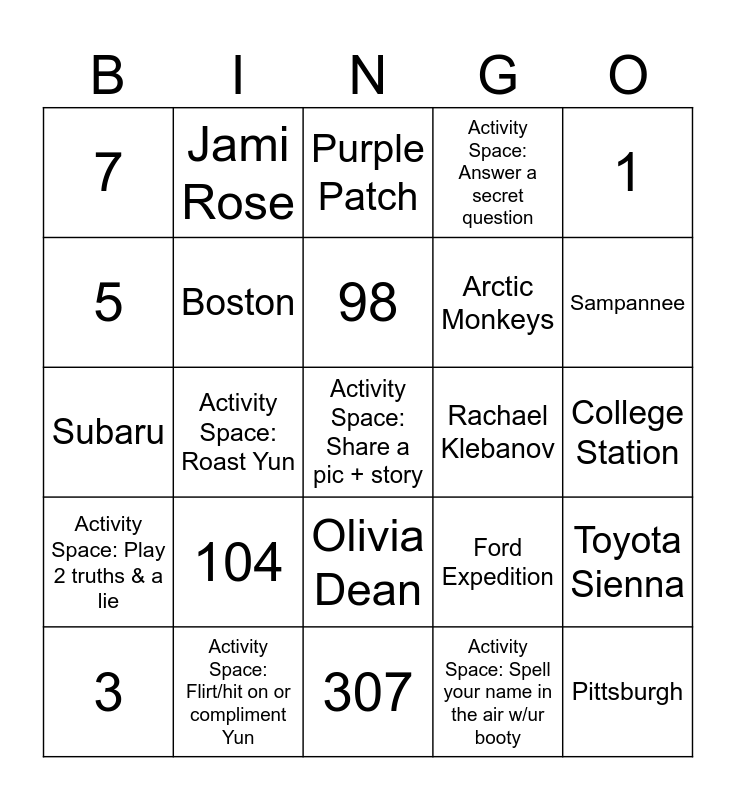 This bingo card has 25 words: 104, 307, 98, 3, 1, 7, 5, Jami Rose, Rachael Klebanov, Olivia Dean, Arctic Monkeys, Subaru, Ford Expedition, Toyota Sienna, Boston, Pittsburgh, College Station, Purple Patch, Sampannee, Activity Space: Roast Yun, Activity Space: Share a pic + story, Activity Space: Flirt/hit on or compliment Yun, Activity Space: Play 2 truths & a lie, Activity Space: Answer a secret question and Activity Space: Spell your name in the air w/ur booty.