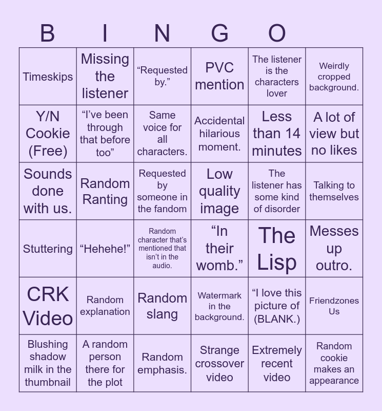 This bingo card has 36 words: Stuttering, “Hehehe!”, Random emphasis., Accidental hilarious moment., The listener has some kind of disorder, Talking to themselves, Timeskips, A random person there for the plot, “Requested by.”, Watermark in the background., Less than 14 minutes, Weirdly cropped background., CRK Video, Random Ranting, Same voice for all characters., PVC mention, “I love this picture of (BLANK.), Messes up outro., Y/N Cookie (Free), “I’ve been through that before too”, Random character that’s mentioned that isn’t in the audio., “In their womb.”, The Lisp, Friendzones Us, Sounds done with us., Missing the listener, Requested by someone in the fandom, Strange crossover video, The listener is the characters lover, A lot of view but no likes, Blushing shadow milk in the thumbnail, Random explanation, Random slang, Low quality image, Extremely recent video and Random cookie makes an appearance.