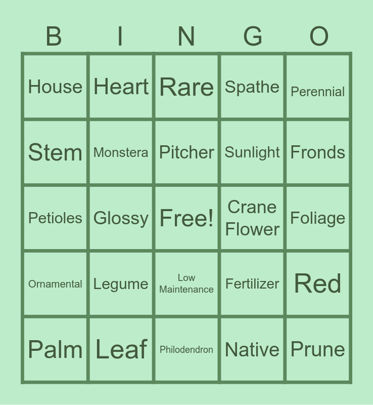 This bingo card has a free space and 29 words: Palm, Green, Glossy, Beginner, House, Rare, Monstera, Legume, Crane Flower, Leaf, Foliage, Prune, Philodendron, Native, Fronds, Endemic, Low Maintenance, Ornamental, Perennial, Petioles, Fertilizer, Soil, Sunlight, Stem, Spathe, Heart, Red, Pitcher and Fragrant.