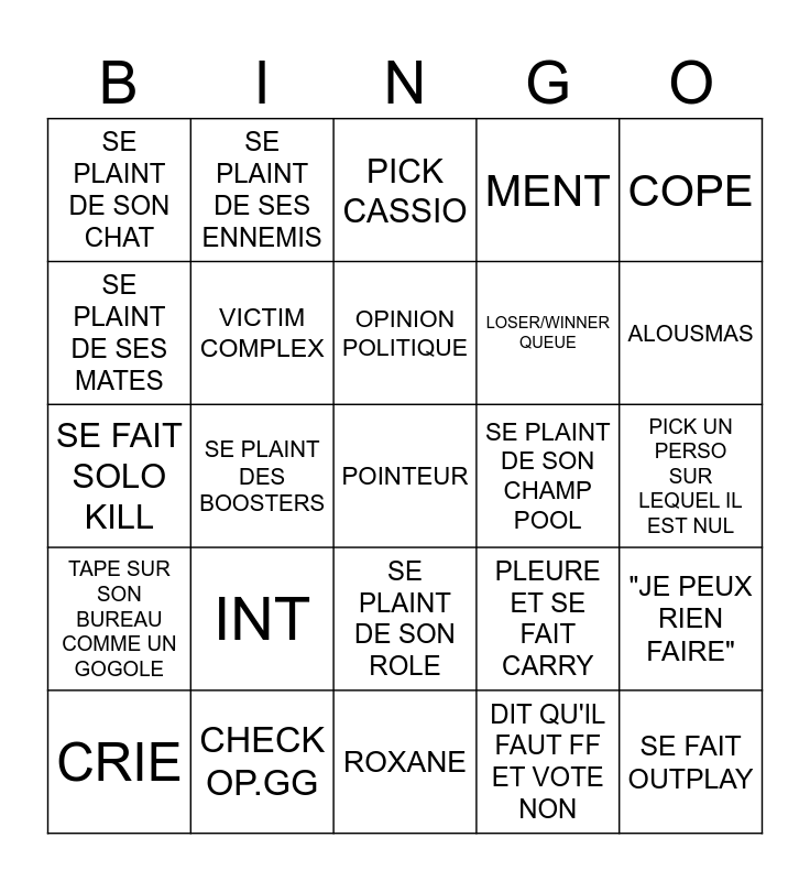 This bingo card has a free space and 24 words: INT, CHECK OP.GG, OPINION POLITIQUE, CRIE, COPE, SE PLAINT DE SON CHAT, SE PLAINT DE SES MATES, SE PLAINT DE SES ENNEMIS, SE PLAINT DE SON CHAMP POOL, SE PLAINT DE SON ROLE, LOSER/WINNER QUEUE, SE FAIT SOLO KILL, PLEURE ET SE FAIT CARRY, "JE PEUX RIEN FAIRE", VICTIM COMPLEX, DIT QU'IL FAUT FF ET VOTE NON, PICK UN PERSO SUR LEQUEL IL EST NUL, PICK CASSIO, ALOUSMAS, SE PLAINT DES BOOSTERS, SE FAIT OUTPLAY, TAPE SUR SON BUREAU COMME UN GOGOLE, MENT and ROXANE.